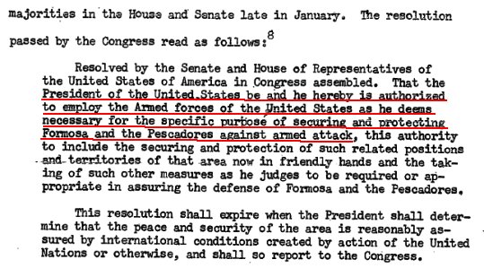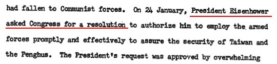 對於這段話,我左思右想,還是想不出它跟前面那句英文之間的邏輯關係。美國如果真的想出兵,可以透過國會授權,就如同1955年一江山失守後一樣: