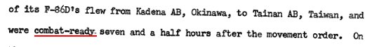 下面這段文字(本文所引用的美方資料都來自美國空軍的AIR OPERATIONS IN THE TAIWAN CRISIS OF 1958這份文件)所提到的16th Fighter-Interceptor Squadron就是不折不扣的戰鬥部隊,它配備的F-86D是戰鬥機,不僅如此,他們在台南是combat-ready的: