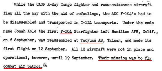 除了台南,美國空軍的F-104也進駐了桃園基地,他們肩負的combat air patrol不是一種戰鬥任務嗎?