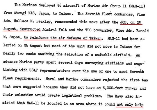 美國海軍陸戰隊也沒有缺席,他們的飛機部署在屏東,他們的任務包括防衛台灣(defend Taiwan):