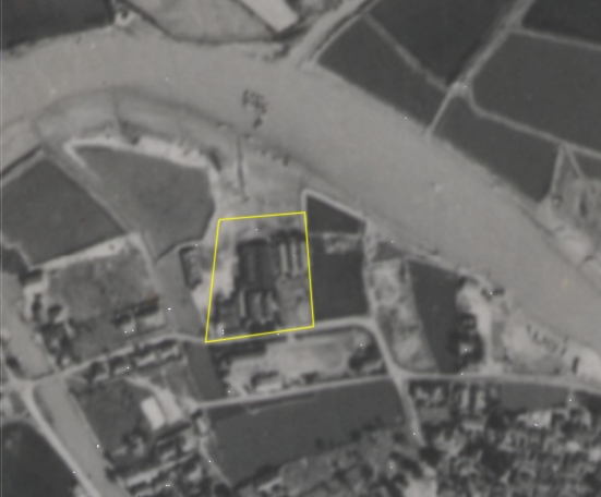 下圖是美軍在1947年拍攝的安平地區空照(我原本找到一張1945年拍攝的,但因解析度不佳而未採用),其中的黃框範圍跟上圖相同,由此可以看到倉庫被榕樹覆蓋前的原貌。園區下方是西門國小(當時稱為安平國民學校),根據該校網頁,是於1939年遷至英國領事館的原址,從這張照片也可以了解安平國民學校的校園配置。