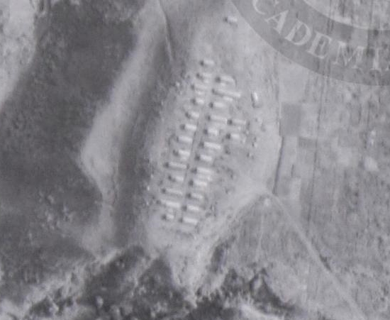 我在瀏覽一捲美軍1945年6月15日拍攝的空照圖(底片罐號B03235)時,發現其中一張照片中有特殊的紋理(上圖中箭頭所指處),放大後可以看到其實這是大約三十棟建築物所形成的(如下圖)。