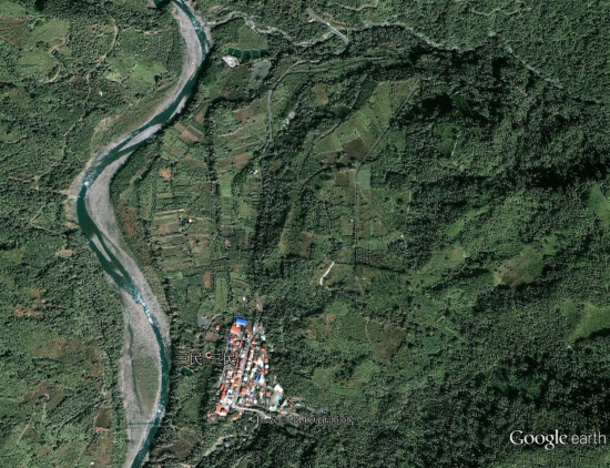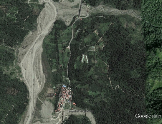 後來我花了一番工夫,才比對出這裡是現在的高雄市那瑪夏區,當年稱為蚊仔只社。之所以不容易在Google Earth上比對出來,是因為這一片區域在八八風災中受創嚴重,造成地貌的劇烈改變。下圖是Google Earth提供的同區域最早一張衛星照片,於2001年11月17日拍攝(八八風災尚未發生),自然地形看來跟最上圖差不多,但是那三十棟建築物已不見蹤跡。