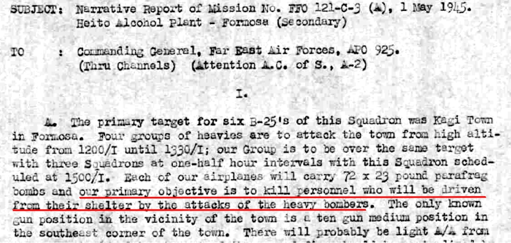美軍在太平洋戰爭期間對台灣空襲的目標遍及軍事設施、港口、工業及生產設施、政府機關、交通運輸、電力設施,但較不為人知的,是美軍也曾規劃與執行以摧毀城鎮為主要目的的轟炸任務。光是在1945年5月,就有兩次以夷平嘉義市為目的的任務,第一次是在5月1日,預計由第22、43、90、380等4個B-24的轟炸大隊先從高空輪番用燒夷彈轟炸,以燒毀當地的建築。接著再由第38轟炸大隊3個中隊的B-25,每隔半小時輪流投下大量的傘降破片殺傷彈並以機槍掃射,用以殺傷已無處掩蔽的民眾。以下是第38轟炸大隊第822轟炸中隊任務報告的一段敘述(點擊可放大):