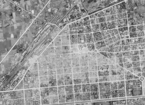 上面第一張照片是美軍飛機於1945年1月18日拍攝的嘉義市空照,第二張的拍攝日期是1945年6月15日。這兩張照片中都可以看見一個由馬路圍起來形成的大等腰三角形(略斜向左下方),建議您用滑鼠點選這兩張照片,觀看放大的版本,比較這個等腰三角形區域在5個月間的變化。