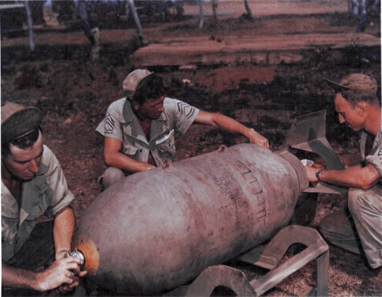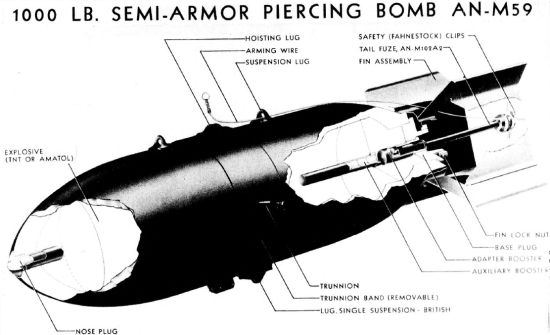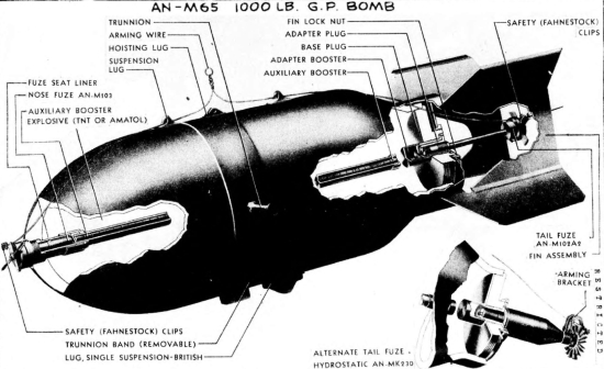 美軍的1000磅通用炸彈編號為AN-M65,全長67.1英吋,直徑18.8英吋,適合用於對付彈藥庫、鐵路車輛與機關車、建築物、輕型船艦等目標。從下面這張二戰期間的彩色照片,可以看出1000磅通用炸彈的相對大小。