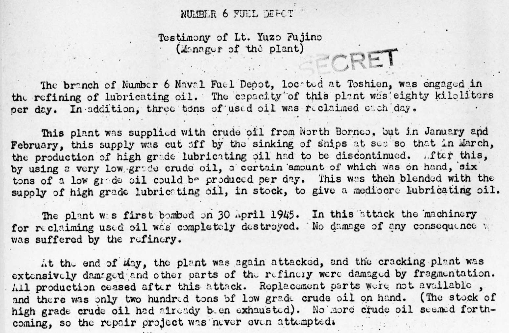 美軍也詰問了日方的藤野勇三技術中尉,以下是相關敘述。美軍的報告稱藤野為Manager of the plant,根據林身振、林炳炎的《第六海軍燃料廠探索》,藤野先在精製部原油蒸餾裝置(620),之後到潤滑油製造裝置(625),戰後留在625,直到1946年2月引揚。《第六海軍燃料廠探索》第308頁有他的回憶。