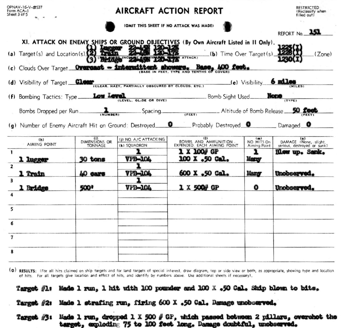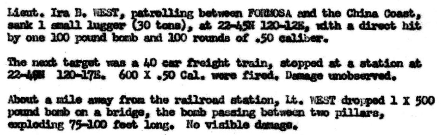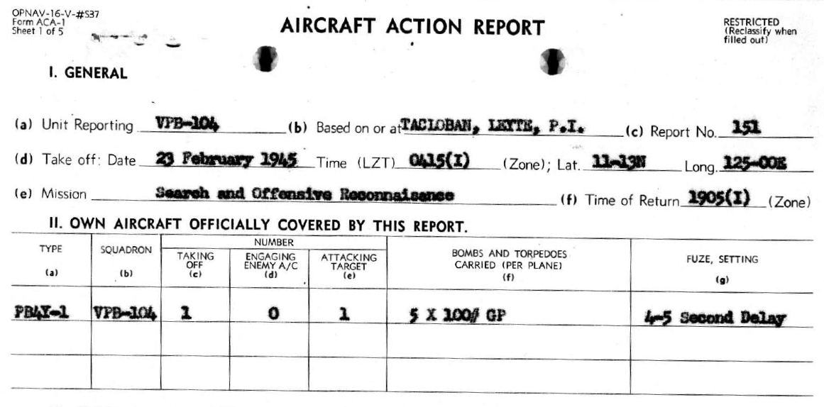 值得注意的是,上表在22日的條目列出了茄萣沿海的漁船攻擊事件,地點雖然正確,但是日期不對。我的書因為略去了攻擊海上船隻的任務,所以書中的2月22日並沒有包含這一項。後來我再去找美國海軍的任務記錄,果然在第104巡邏轟炸中隊的檔案裡,找到了1945年2月23日的任務。以下是從任務報告節錄的兩個表格: