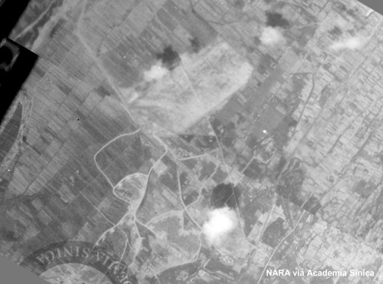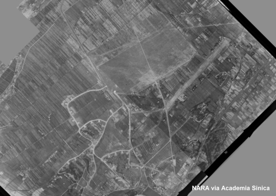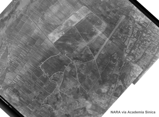 The 1944 reconnaissance photo reveals the then unfinished Koryu Airdrome (currently Houlong in Miaoli County). By the time when the next two photos were taken in 1945, all the revetments had been completed, the main taxiway, as long and wide as a runway, had taken shape, and the landing area had been expanded.