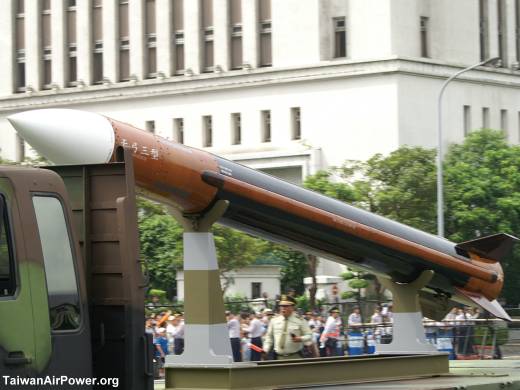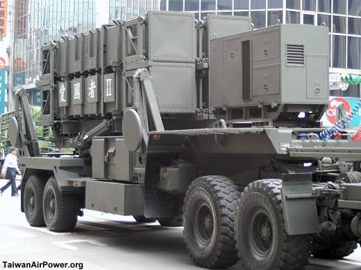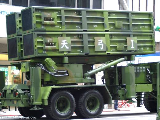 Tien Kung 1 and PAC 2 launchers have similar elevation mechanisms in that their missile canisters are both elevated by dual hydraulic cylinders located on both sides of the trailer. Both launchers are trainable in azimuth. Being vertically launched, Tien Kung 3 has a different elevation mechanism. But it is hard to tell from these pictures how the missile canisters are erected.