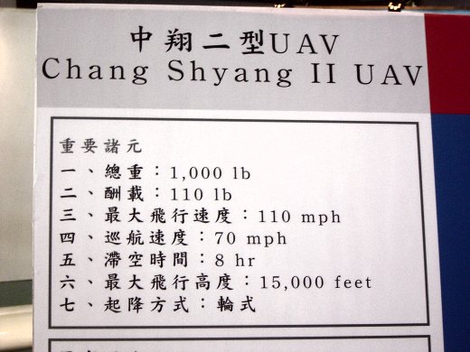 因為機緣巧合,我得以對「天隼二型」的發展歷程有些了解。然而對於「中翔」UAV,我卻是所知甚少。中科院在桃園航太嘉年華所提供的「中翔二型」性能諸元,也只有如下寥寥幾行而已: