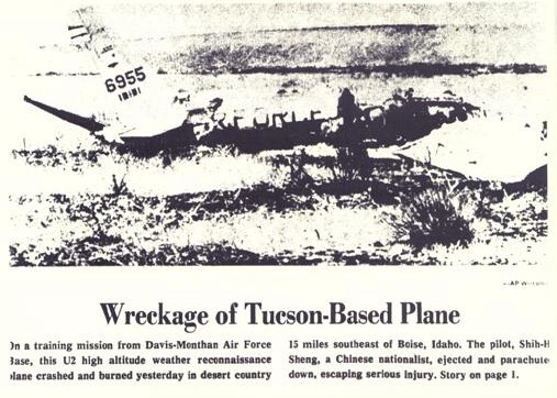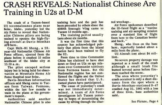 This is a clip from the newspaper Tuscon Daily Citizen, August 15, 1964. After the crash, Capt. Shih-Hi “Steve” Sheng (盛士禮, Shih-Li Sheng) was allowed to continue his training on the U-2. However, Sheng crashed another U-2 four months later. This time, he was asked to leave the program…