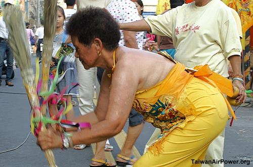 My first time to see a female ji tung (乩童, a spirit medium) in action.