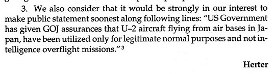 Then, on May 1, 1960, the U-2 piloted by CIA’s Gary Powers was shot down over the Soviet Union. This incident put the Japanese government under a lot of pressure from its citizens because CIA maintained its U-2 Detachment C at NAS Atsugi. Secretary of State Herter sent the following telegram to the US Embassy in Japan after the incident: