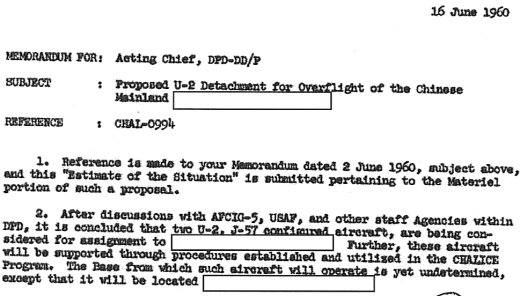 We know this is an outright lie because U-2 taking off from Japan had engaged in the reconnaissance overflight of China during the 1958 Taiwan Strait crisis. Anyway, the search for a suitable operating location in Taiwan for the proposed U-2 detachment continued. As of June 1960, the site had not been decided, as shown by the following memorendum: