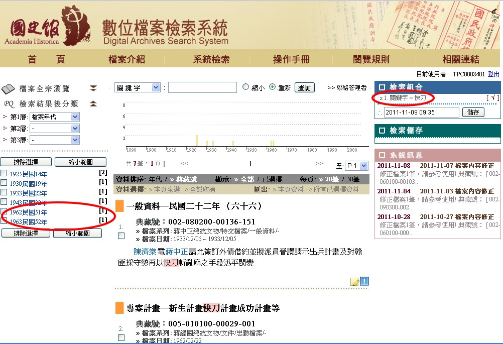 目前在國史館數位檔案檢索系統查閱得到的相關檔案主要是快刀計畫成立後蔣經國與中情局台北站之間的會議記錄,但是在這項計畫成立過程中的文件卻幾乎都查不到。下圖是用「快刀」這個關鍵字(右方紅圈)查詢所得的7項結果(查詢日期:2011/11/09),其中只有兩項真正有關(左方紅圈),其他都是提到「快刀斬亂麻」這個用語(點擊下圖可放大):