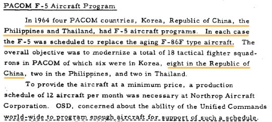 The 1964 CINCPAC History has an overview on the PACOM F-5 Aircraft Program. The original objective of program was to equip Taiwan, Korea, the Philippines, and Thailand with 18 F-5 squadrons. The goal was later scaled back to 15 squadrons, including 7 squadrons for ROCAF.