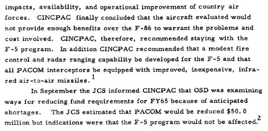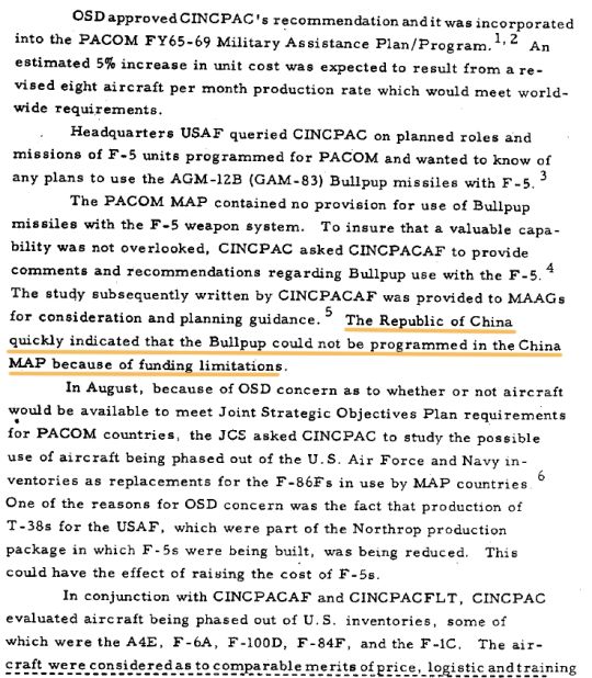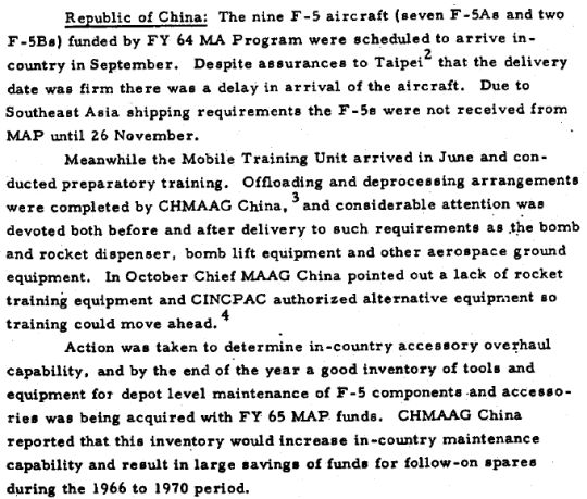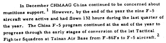 Almost three years ago, I wrote about ROCAF F-5A/B, based on US Military Assistance Program Master File. The number of acquired aircraft given by the source was inconsistent with the number provided by CAF2000, an expert on ROCAF F-5. So I am going to post the passages about ROCAF F-5A/B I found in the CINCPAC History series. Hopefully we will have a clearer picture of this program.