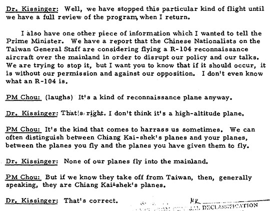 前美國總統尼克森在1971年7月中公開宣佈將於次年訪問中華人民共和國,對當時的中華民國政府造成極大的衝擊,這也讓美國擔心國府是否會做出激烈的手段。當尼克森的國家安全助理季辛吉在同年10月20日二度前往中國,為尼克森的訪問行程作準備時,在一次會談中對中國總理周恩來表示,美國已經獲得情報,國府打算派遣RF-104偵察機進入中國大陸,藉此阻撓華盛頓與北京的對話,但美方已經出手阻止。以下文字節錄自季辛吉與周恩來在10月23日的會談記錄,季辛吉所稱的R-104應該是RF-104之誤:
