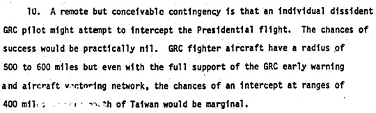 美國的中央情報局(CIA)在評估了所有可能對尼克森訪中不利的事件和可能性後,在1972年2月10日提出了一份標題為「Security Conditions in China」的評估報告。其中提到,可能會有心存不滿的國府飛行員會試圖攔截尼克森總統的專機,不過發生的可能性很低,被攔截成功的機率也微乎其微: