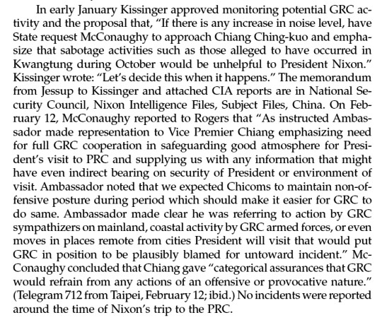 所幸國府在尼克森訪問中國期間非常自制,正如第二份文件最後所說,沒有發生任何事件。然而由於中央情報局在前一年曾掌握到國府空軍可能會利用U-2飛進大陸來擾亂美中關係的情報,所以其實在尼克森動身前就對駐於桃園基地的U-2「點了穴道」,以更積極的手段防範未然。至於中央情報局究竟使用了什麼招數,就請參考我即將出版的書了。