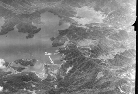 The following photo, looking south at Jitsugetsu Tan (Sun Moon Lake), was taken on March 23, 1945, the day of massive bombing by USAAF B-24 heavy bombers. The location of Target 181 Suisha Dam is indicated by the arrow (by me), which is at the northwest corner of Jitsugetsu Tan.