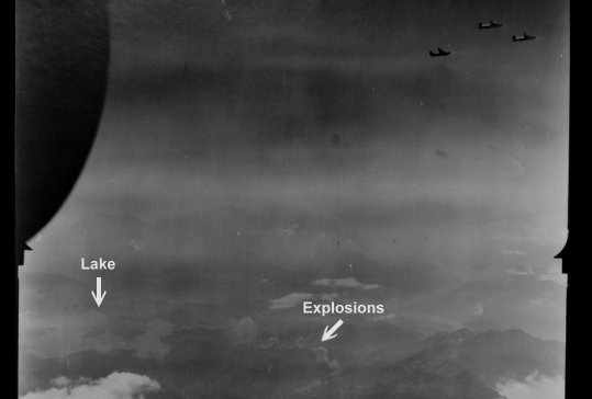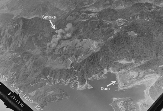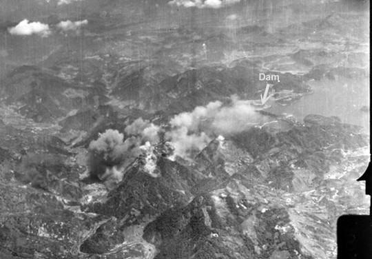 Moments after the above photo was taken, bombs started to fall on the west side of the lake. Although Shuisha Dam was listed as a target in the intelligence report, none of the bombs hit the dam on this day. It seemed the American had purposedly spared the dam.