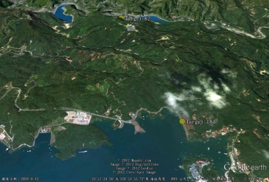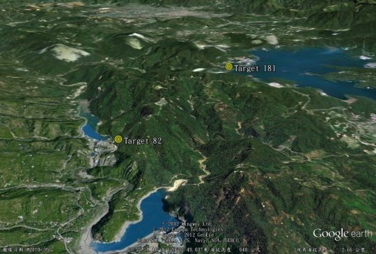 利用Google Earth比對,可以發現美軍飛機從水社堰堤(181號目標)的方向一直炸到日月潭第一發電所(82號目標)附近。我的下一篇貼文就會分享當時第一發電所被炸的景象。