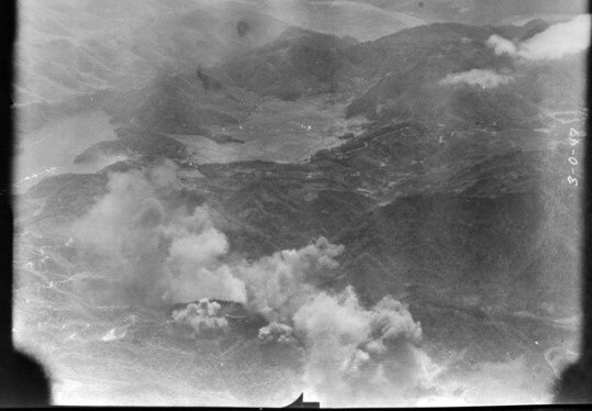 下面這張照片的拍攝時間應該比上圖稍晚,因為照片裡已經可以看到炸彈爆炸產生的濃煙。雖然水社堰堤被美軍列為181號目標,當天卻沒有炸彈直接落在壩上,可能是美軍決定不炸水社堰堤了。