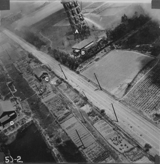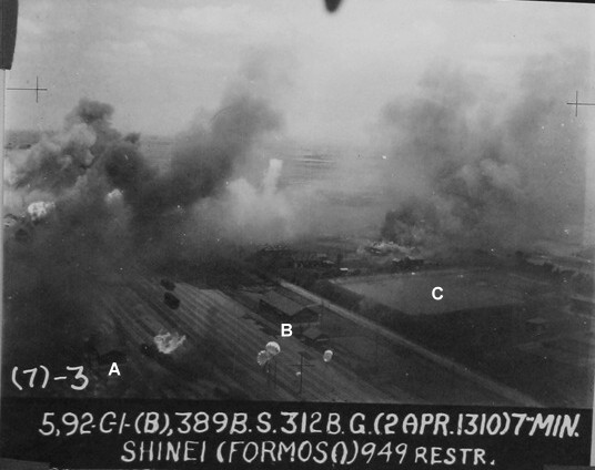 1945年4月2日,18架隸屬於美國陸軍航空隊第312轟炸大隊旗下388與389轟炸中隊的A-20輕型轟炸機,從菲律賓呂宋島起飛執行第92-C-1號任務,轟炸台灣新營一帶的鐵路設施與車輛。上面的照片是由389中隊的一架飛機拍攝,可見鐵路場站設施已經被爆炸引起濃煙掩蓋。比對美軍之前拍攝的偵察照片,我標出了上圖中一部份建築物的位置: