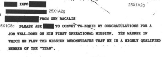 The above document is rare in that the US government officials forgot to black out two personal names: Tom and Eddie, which refer to Tom Hwang (黃榮北) and Eddie Chou (鄒燕錦), respectively. These two pilots are also rare among all Blackcats: combined, they had flown a total of three missions.