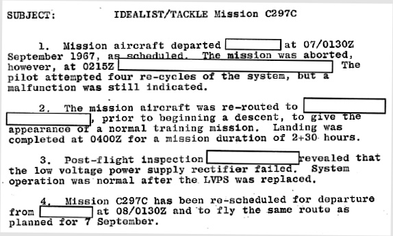 美國方面至今仍未將9月7日執行任務的飛行員姓名解密(根據規定,這類姓名應該永遠都不會解密),不管他是誰,他在起飛後不到一個小時就因為系統故障取消任務。因為這次任務幾乎是一開始就中止,所以C297C的任務編號保留,延到第二天相同時間再執行一次。