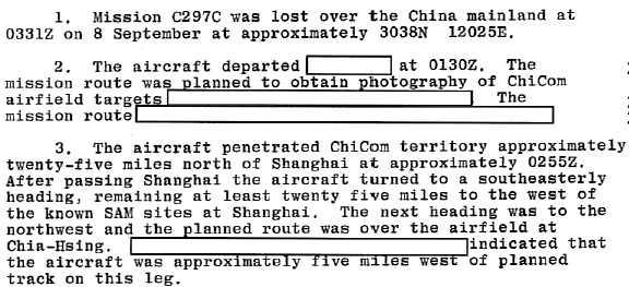 原訂1967年9月7日執行的C297C號任務,主要的偵察目標是嘉興、杭州筧橋、寧波、路橋、福州義序、龍田等機場,從這些目標的位置看來,此次任務應該是國府方面要求執行的。