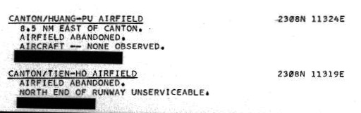 Tiger Wang of ROCAF’s 35th Squadron carried out his first-ever U-2 reconnaissance mission (GRC-106) over China on March 26, 1962. This mission covered most airfields in the southeast China. CIA’s photo interpreters found as many as 34 airfields in the photos! The following image, taken from GRC-106 Immediate Photographic Interpretation Report, lists two of the four airfields found around Canton (now Guangzhou):