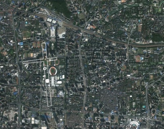 網路上有資料說天河機場就位於現在的天河體育中心,所以稍加比對後,就可以確認天河機場的位置(白線繪出的輪廓):