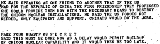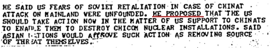 以上這段文字中的He,指的都是蔣介石。提到要美方提供必要手段來破壞中共核武設施(provide them now with the necessary means to destroy the ChiCom nuclear installations)的也是蔣介石,他還說美方不需要出兵,只要提供裝備與支援,由國府自己來幹(He said US forces not needed, only equipment and support. ChiNats would do the jobs.)。
