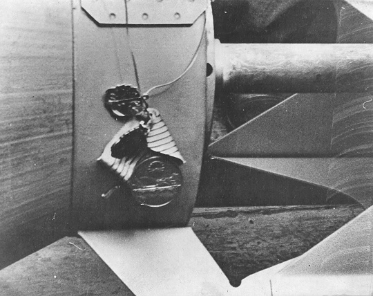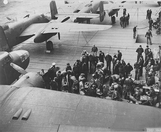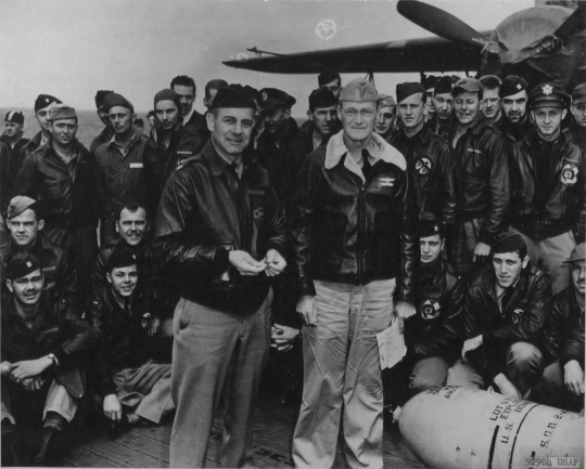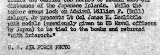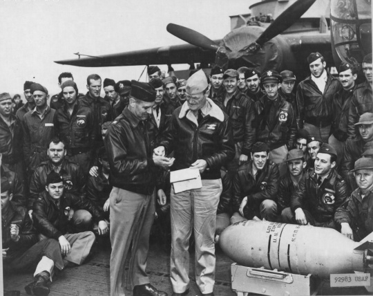 The next two photos show the skipper of USS Hornet, Capt. Marc A. Mitscher presents a medal to Lt. Col. Jimmy Doolittle. However, this medal was not awarded to Doolittle. It had been given by the Japanese government to Navy Lieutenant c, who had received it during pre-war naval attaché service. Jurika donated the medal and wished to return it to a hostile government. The bomb in the pictures is the same one as in the top photo.