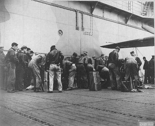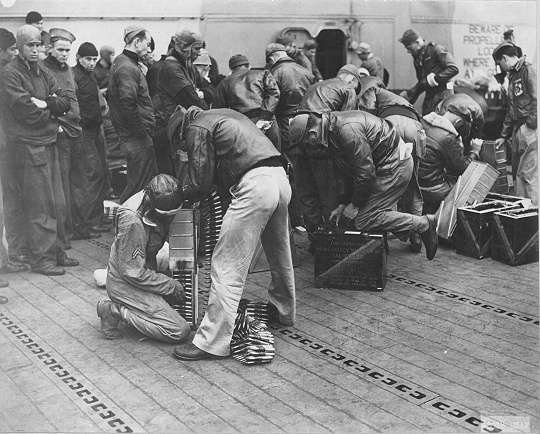 The following three photos show the bomber crews are busy loading ammunition into the magazines in final preparation for the raid.