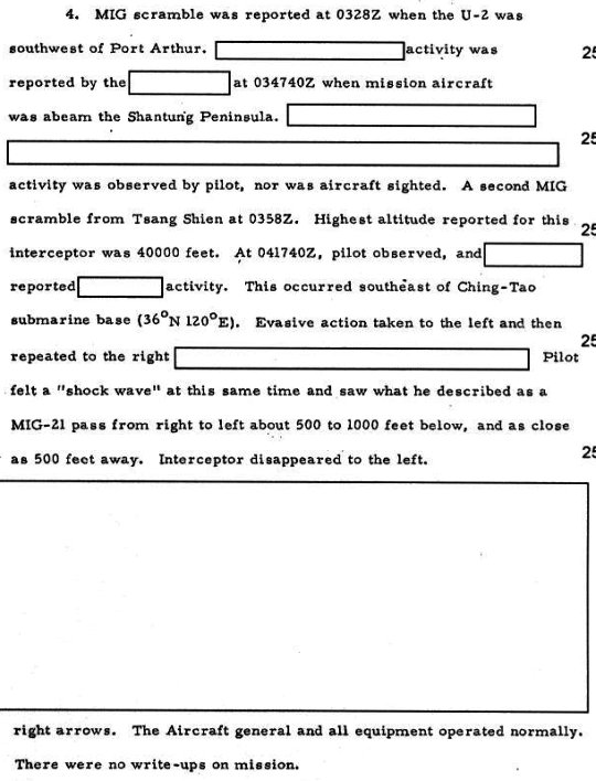 報告中有一大塊文字沒有解密,很可能就是描述20號系統的運作,因為倒數第二行有right arrows兩個字,恰好跟「螢幕上同時出現指向左和向右的箭頭」不謀而合。不過這也只是我個人的猜想而已。由於事隔四十年,兩次任務又都涵蓋同樣的地區,所以書上的日期出現錯誤,也是情有可原。