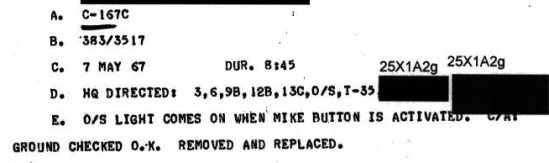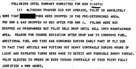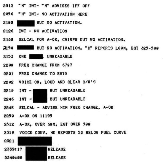 以下是本次任務中無線電通訊的部分內容,大部分通訊內容都不是語音通話。《黑貓中隊:七萬呎飛行紀事》的第二章曾提到飛行員可以撥到A開關來表示一切正常,這就是以下記錄中的「A-OK」。最後兩行分別是兩具偵測裝備莢艙投下的時間,如上面的第一份文件所說,中間相隔了49秒。