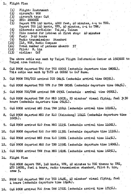 這架班號106的飛機的確如管文所述,「就像縱貫線的對號列車一樣」,在各大城市間穿梭。管文和崔文都指出這架飛機當天的航線是台北–台中–台南–馬公–台南–台中–台北,但從調查報告所提供的飛航計畫來看,這架C-46那天的航線複雜多了,光是馬公就飛了兩趟: