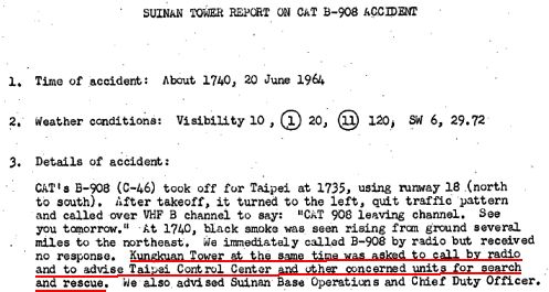 1964年6月20日在神岡地區上空發生的民航空運公司(Civil Air Transport Co. Ltd.)C-46 B-908空難,在沈寂多年後,前一陣子因為當地居民所經歷的靈異事件,又再度登上報紙。我在網路上所找到的相關中文網頁中,多半是以資深廣播人崔小萍女士所著『天鵝悲歌』的書摘和管仁健先生部落格上的『台灣對中國的「奪機」鬧劇』為主要資訊來源。民航空運公司在當年空難發生後也派員調查,而間接擁有民航空運公司40%股權的美國中央情報局(CIA)在45年後公開了一部份的調查報告,讓我們對這件可能是台灣史上首次劫持民航機事件又多了一層了解。