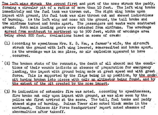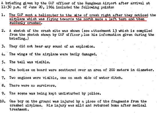 當天行程台中的起降,完全是因為陸董這一團要趕圓山飯店的晚宴,也就是說機上除了機組員、民航公司員工、美軍與眷屬、電影團,唯一陌生的就是這兩個軍人。民航公司為什麼賣票給這兩個人?至今也依然是謎。如果我沒猜錯,這兩個人一定與CIA有什麼線民關係,否則CIA也好、陳香梅也好,不可能去幫老蔣擦屁股的。